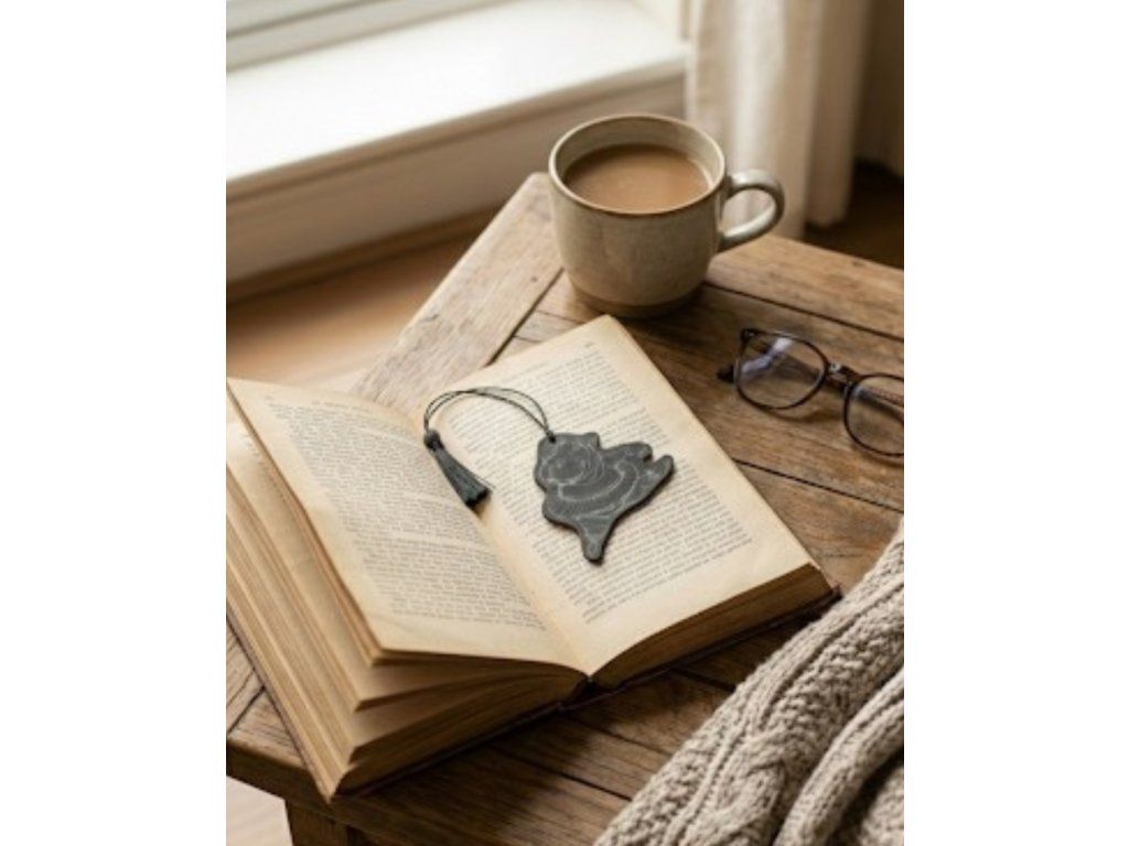 Ručně vyráběná záložka z černé kůže, doplněná o originální motiv hrošice v baletní tutů. Produkt kombinuje praktické využití s nezaměnitelným rukopisem naší dílny na Tenerife.