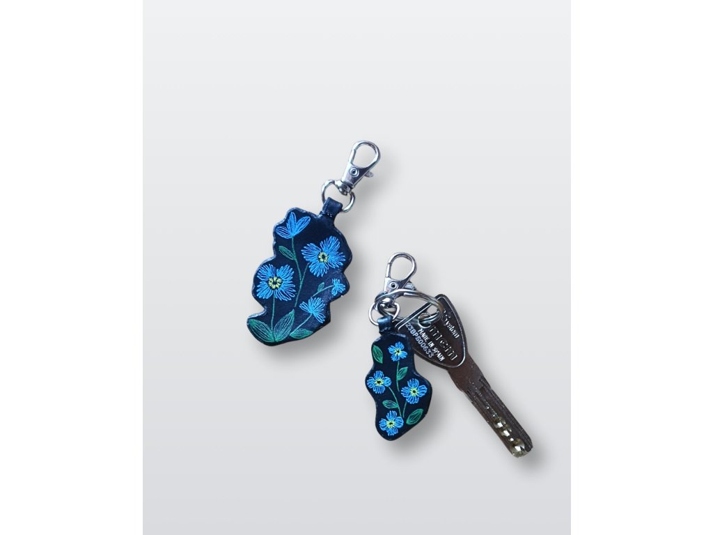 • Podobné, a přesto jiné: Obě klíčenky jsou zdobeny motivem modrých květů s jemným žlutým středem na černém koženém podkladu.